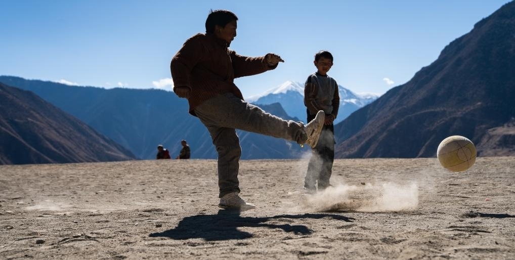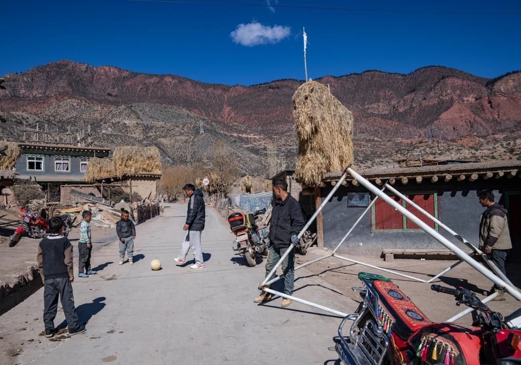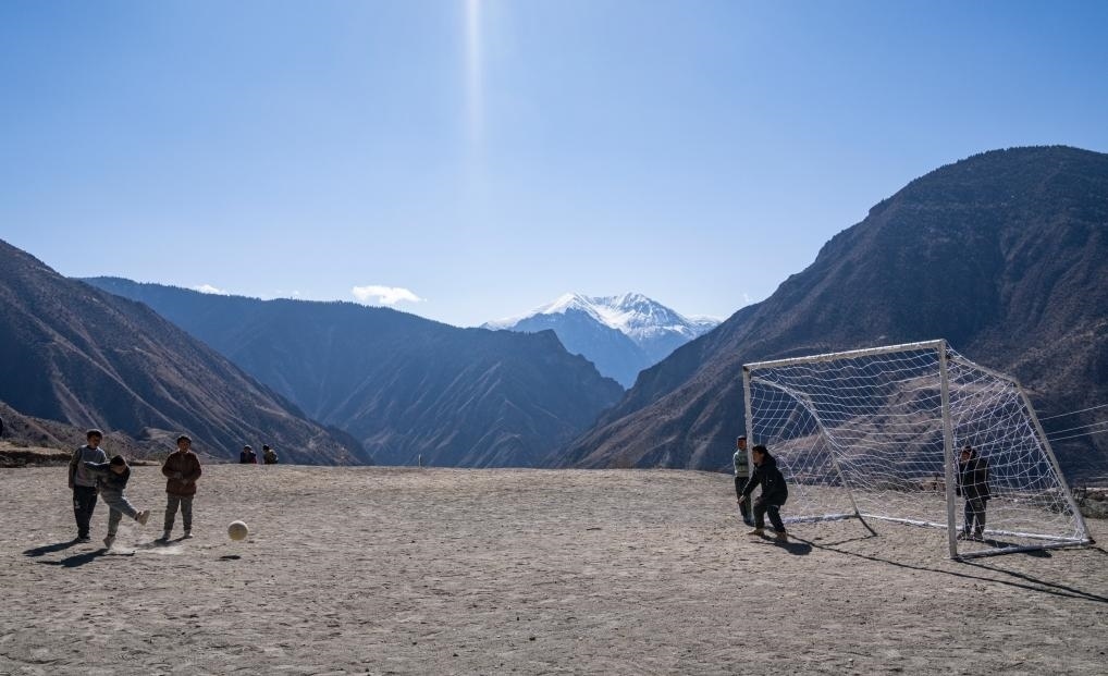 等待焊接的一會兒工夫,村里的孩子們也要跑來和嘎瑪群美踢兩腳