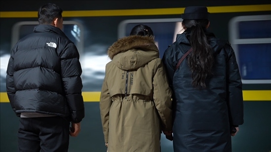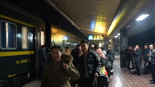 14號車廂內,來自黑龍江省齊齊哈爾市泰來縣的王興海和陳玉倩望著車窗外、站臺上的王靚怡,喜笑顏開??缭?700多公里、歷時52個小時,只為給女兒一個驚喜,陪她在崗過年。