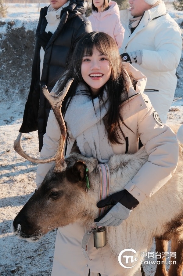 1月26日,2024年全國(guó)臺(tái)聯(lián)第三十屆臺(tái)胞青年冬令營(yíng)內(nèi)蒙古分營(yíng)一行人前往敖魯古雅鄂溫克民族鄉(xiāng),陳紀(jì)陵與馴鹿合影留念。(臺(tái)灣同學(xué) 王奕勛 攝)