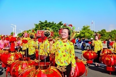 泉州市蟳埔村,蟳埔女挑起竹籃和彩燈,盛裝出行。王志超攝