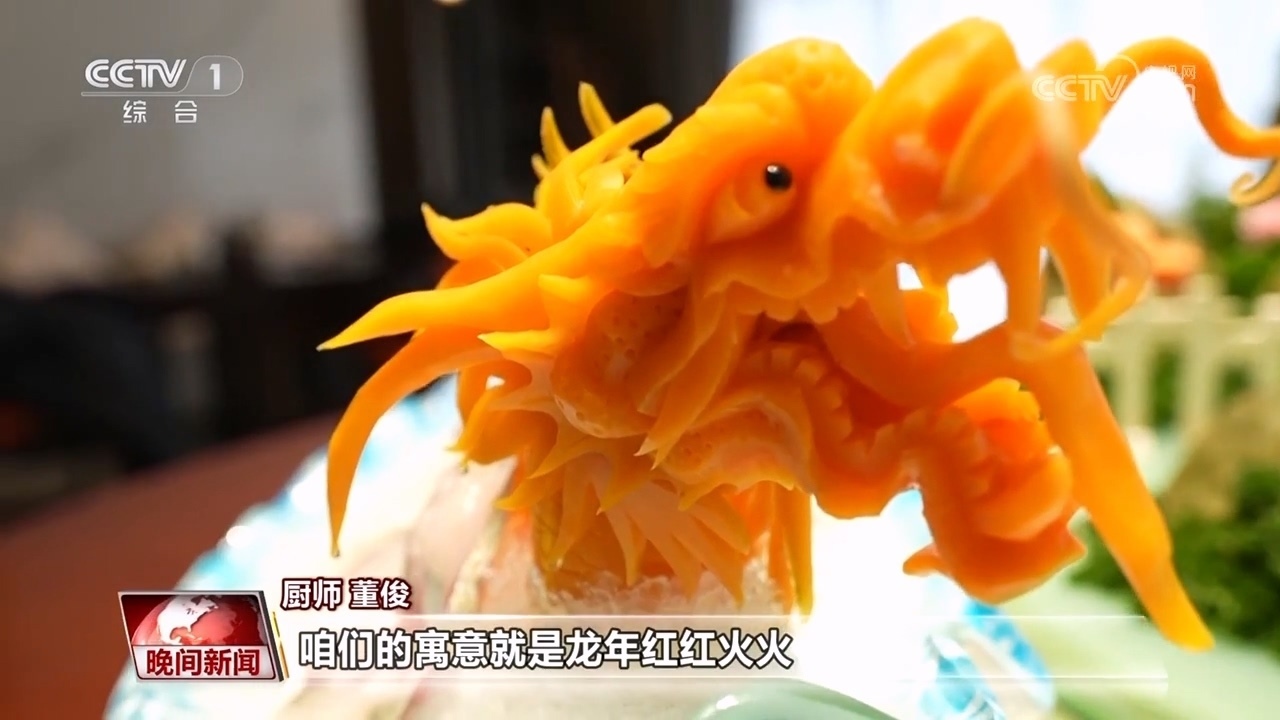 廚師 董俊:把魚切成薄片,用濃湯涮熟,擺盤呈現(xiàn)一條龍的造型,咱們的寓意就是龍年紅紅火火、風調(diào)雨順、年年有余。