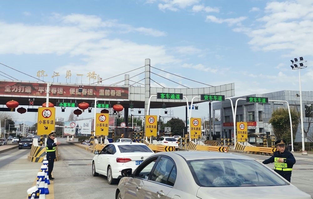 2月13日,安徽銅陵長(zhǎng)江公路大橋管理處工作人員指揮引導(dǎo)車輛安全有序通行。新華社發(fā)(陶濤 攝)