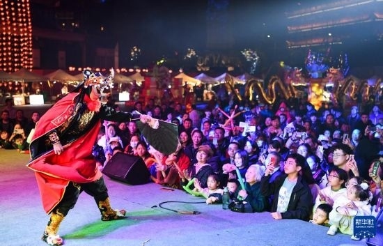 2月14日,市民和游客在重慶南濱路鐘樓廣場觀看川劇表演。