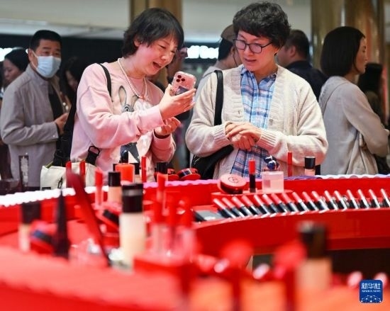 消費(fèi)者在??趪H免稅城選購化妝品(2月11日攝)。