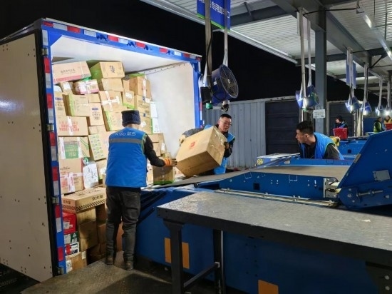 2月8日,菜鳥速遞北京順義二級(jí)分撥中心,工作人員正在卸車。新華社記者 魏弘毅攝