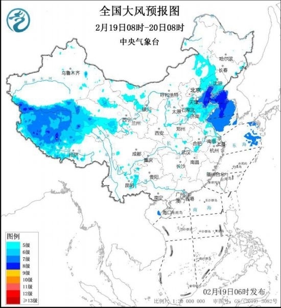中央氣象臺2月19日6時繼續(xù)發(fā)布大風(fēng)藍(lán)色預(yù)警:預(yù)計,2月19日8時至20日8時,西藏中西部、青海中南部、內(nèi)蒙古東南部、遼寧西部和南部、華北東部、黃淮東部、江淮東部等地的部分地區(qū)有5~6級風(fēng),陣風(fēng)7~9級。渤海、渤海海峽、黃海大部海域?qū)⒂?~8級風(fēng),陣風(fēng)9~10級。