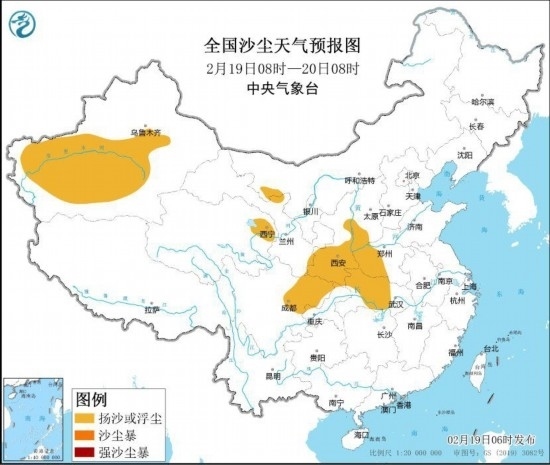 中央氣象臺2月19日6時繼續(xù)發(fā)布沙塵暴藍(lán)色預(yù)警:預(yù)計2月19日8時至20日8時,新疆南疆盆地、內(nèi)蒙古西部、青海東北部、陜西中南部、山西西南部、河南西部、湖北中西部、四川盆地中北部等地的部分地區(qū)有揚(yáng)沙或浮塵天氣。