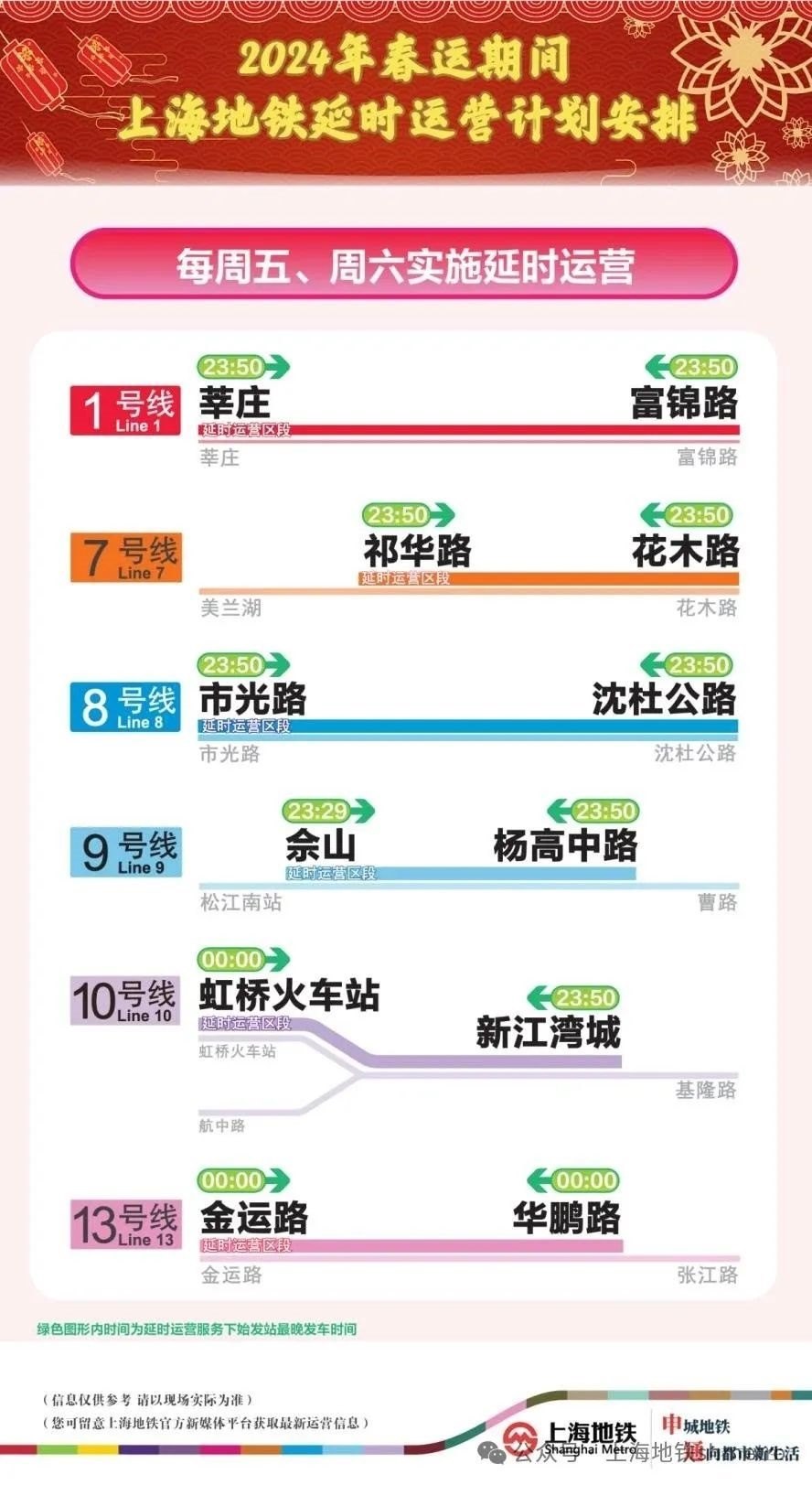 2月17日(周六),上海地鐵1、7、8、9、10、13號線繼續(xù)執(zhí)行常態(tài)周末延時運營方案,提請市民乘客注意末班車時間。