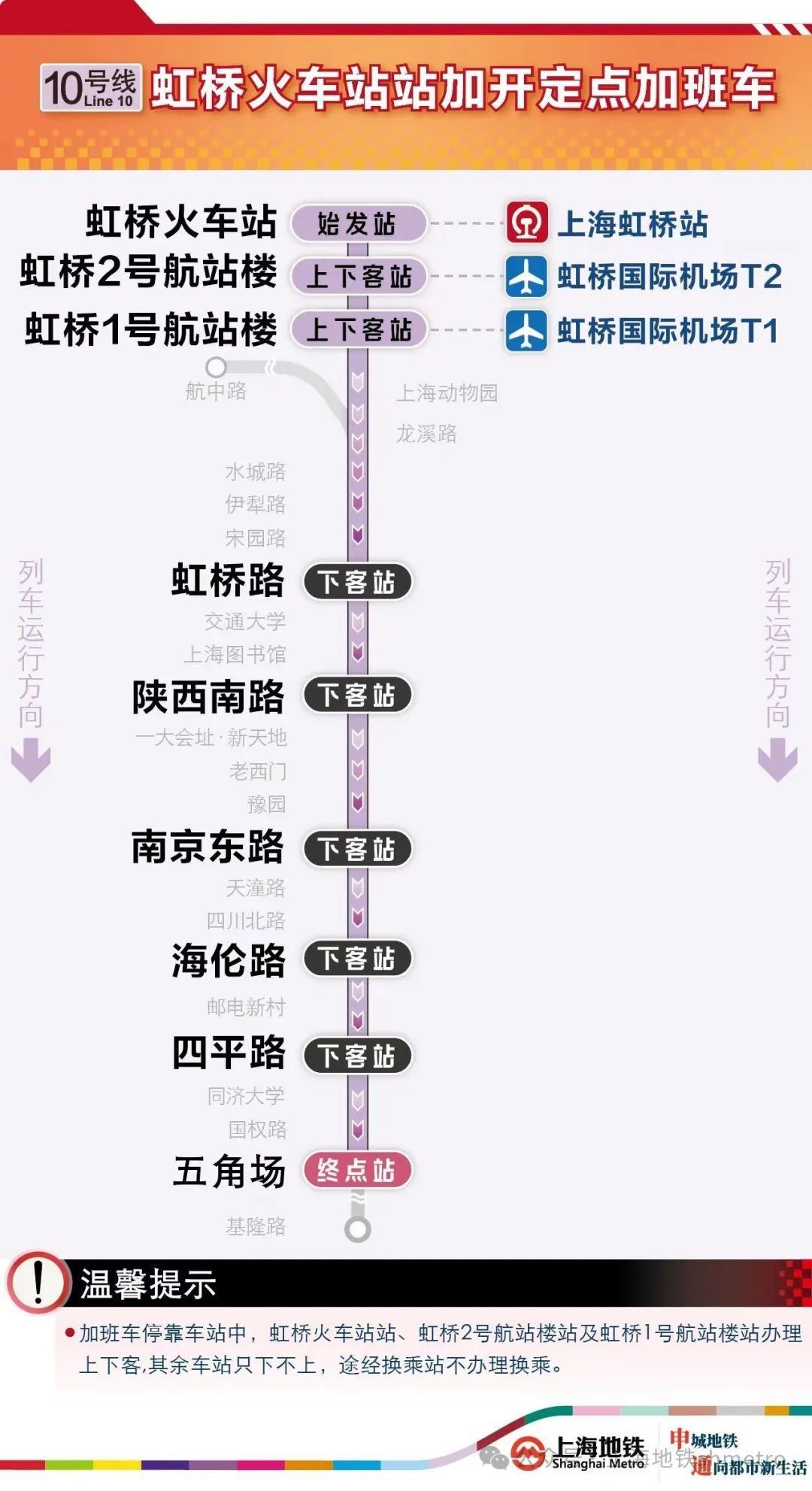 今日,10號線虹橋火車站加班車延長至2月18日2:30。其中,10號線虹橋火車站站往五角場站方向定點加班車沿途僅??亢鐦蚧疖囌菊尽⒑鐦?號航站樓站、虹橋1號航站樓站、虹橋路站、陜西南路站、南京東路站、海倫路站、四平路站、五角場站,其余車站跳停。停靠車站中,虹橋火車站站、虹橋2號航站樓站、虹橋1號航站樓站可同時上下客,其余車站只下不上,途經(jīng)換乘站不可換乘。