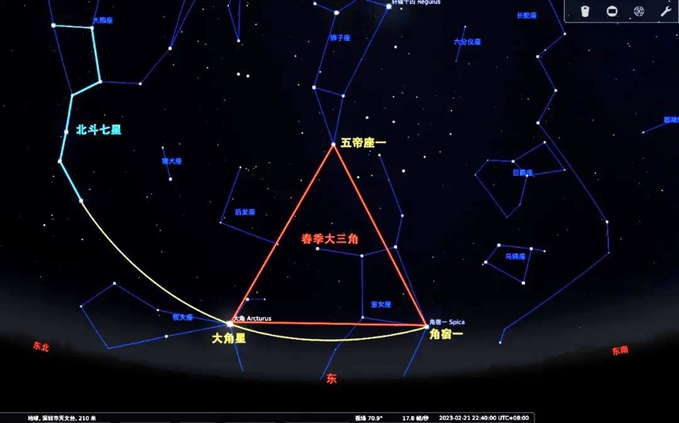 (2)沿著北斗七星的勺柄曲線進行延伸,可以找到牧夫座α,這顆星我們一般稱之為“大角星”。