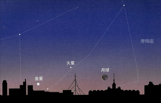 觀星指南:當天,天亮前我們看向東南方低空,就能見到亮度負3.8等的金星和亮度1.2等的火星,以及一彎細細的殘月,三者位置大致形成一個三角形。此時就能看到金星、火星伴月天象。