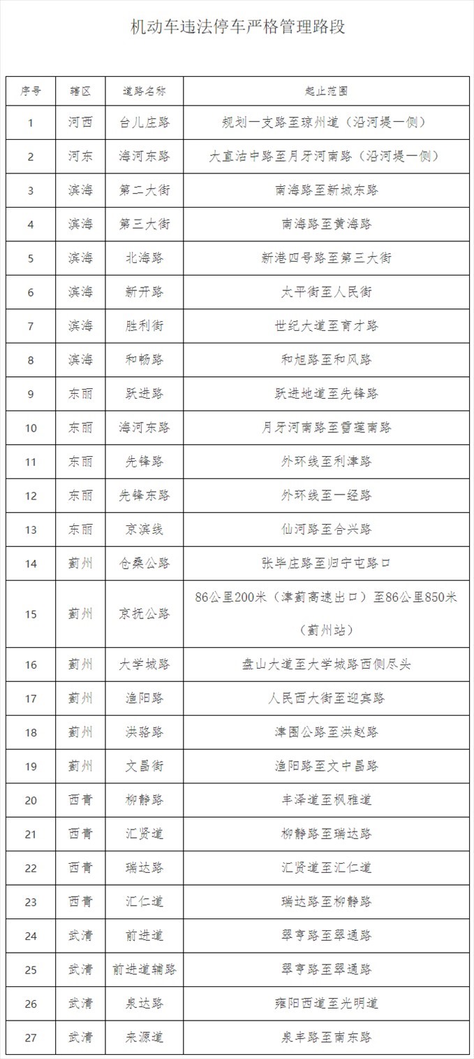 為進一步加強天津市道路交通安全管理,規(guī)范靜態(tài)交通秩序,提高道路通行能力,根據(jù)《中華人民共和國道路交通安全法》及其實施條例等有關法律法規(guī)規(guī)定,天津市公安交通管理局根據(jù)道路通行實際情況,決定自2024年3月18日起,將下列27條路段設置為機動車違法停車嚴格管理路段。機動車在嚴格管理路段內違法停放的,公安交管部門將在提醒糾正的同時依法予以處罰。