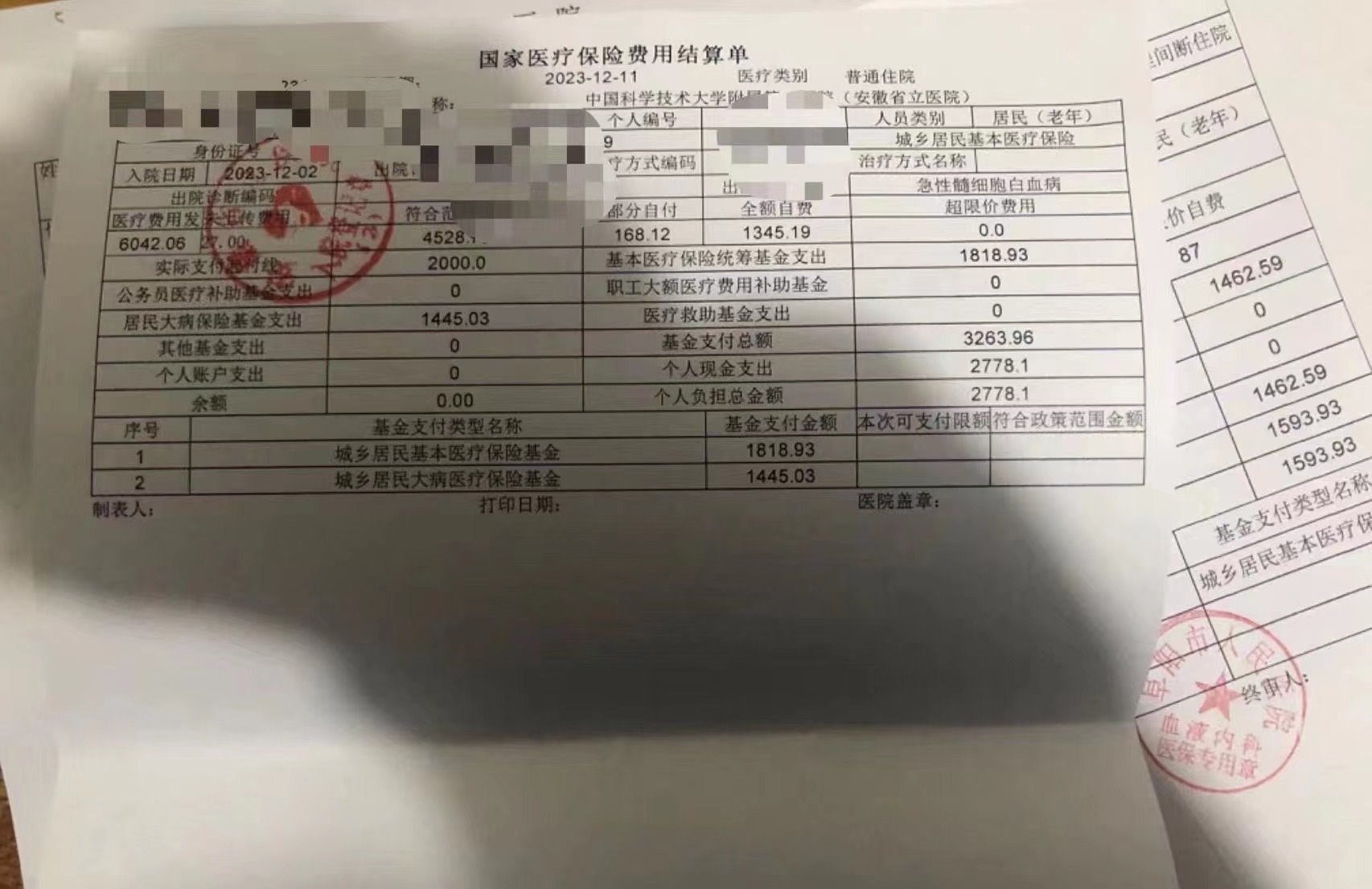 2023年秋季,她老公患上急性髓細胞白血病,后在合肥市某醫(yī)院治療,住院費共花費近10萬元,而自己僅交了2萬多元。