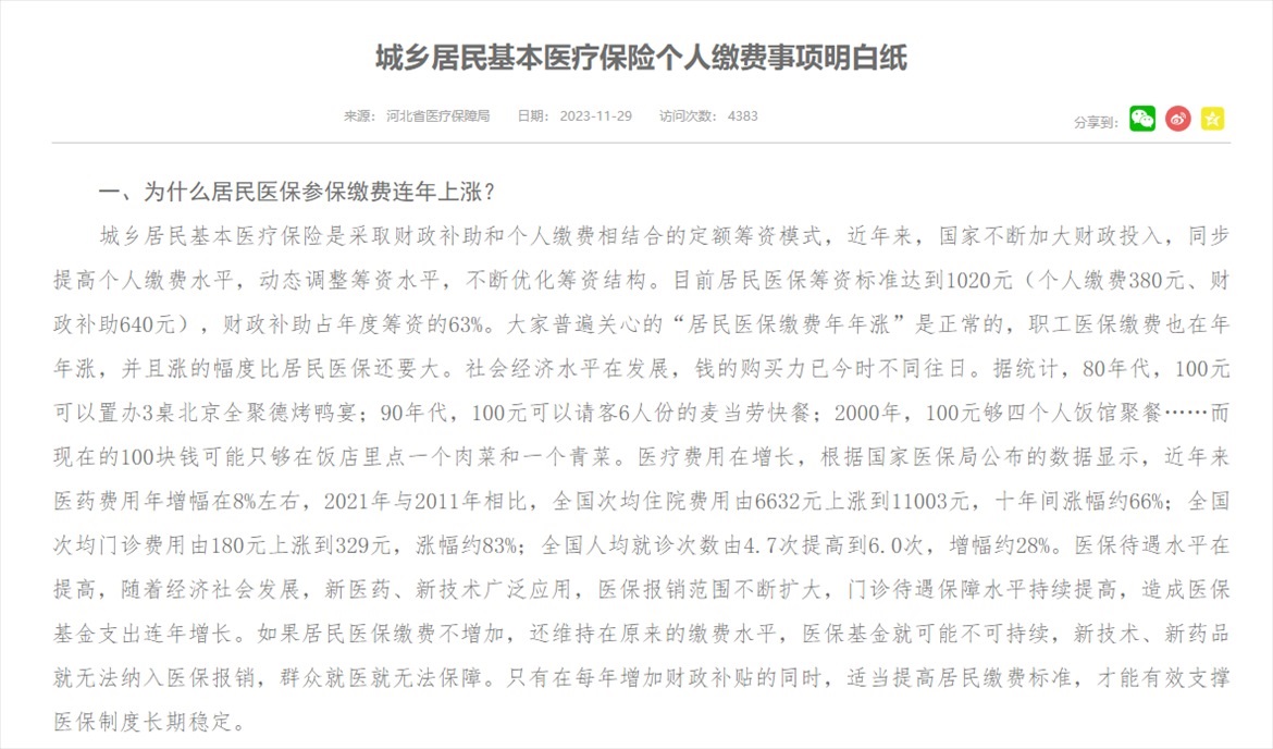 記者注意到,河北省醫(yī)保局去年11月份曾發(fā)布《城鄉(xiāng)居民基本醫(yī)療保險個人繳費事項明白紙》,其中就“為什么居民醫(yī)保參保繳費連年上漲?”問題回應稱:“大家普遍關(guān)心的‘居民醫(yī)保繳費年年漲’是正常的,職工醫(yī)保繳費也在年年漲,并且漲的幅度比居民醫(yī)保還要大。社會經(jīng)濟水平在發(fā)展,錢的購買力已今時不同往日,醫(yī)療費用在增長,醫(yī)保待遇水平在提高。如果居民醫(yī)保繳費不增加,還維持在原來的繳費水平,醫(yī)?;鹁涂赡懿豢沙掷m(xù),新技術(shù)、新藥品就無法納入醫(yī)保報銷,群眾就醫(yī)就無法保障?!?/p>