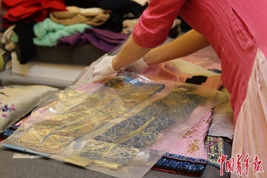 工作人員整理畢紅珍藏的清代宮廷服裝和繡品。中青報·中青網(wǎng)記者 余冰玥/攝