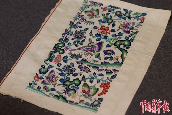 畢紅珍藏的清代宮廷繡品,鳳蝶寓意“喜相逢”。中青報·中青網(wǎng)記者 余冰玥/攝