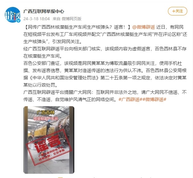 ·廣西互聯網舉報中心:“廣西西林核潛艇生產車間生產核彈頭”系謠言。