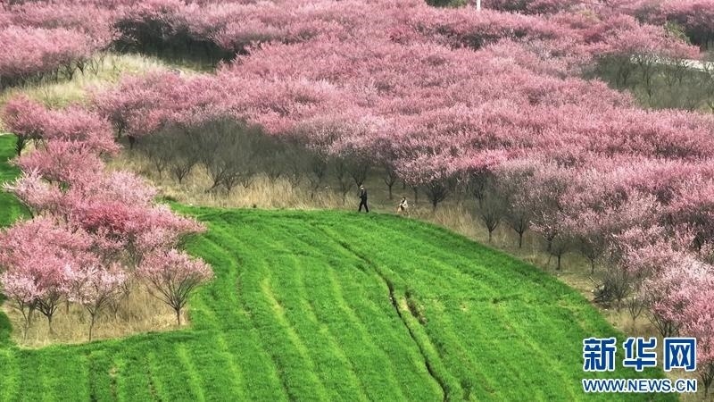 近日,湖北省老河口市李樓鎮(zhèn)鮑河村400畝紅梅次第開放,園內宛若一幅紅粉畫卷。