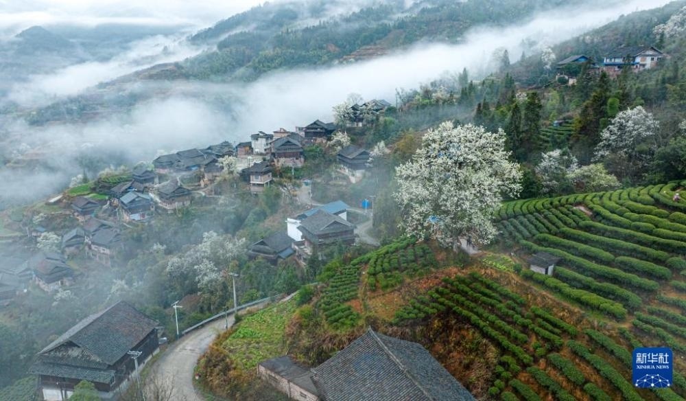 春到茶鄉(xiāng),廣西三江侗族自治縣的村寨、山花與茶園構成美麗的田園圖畫。?