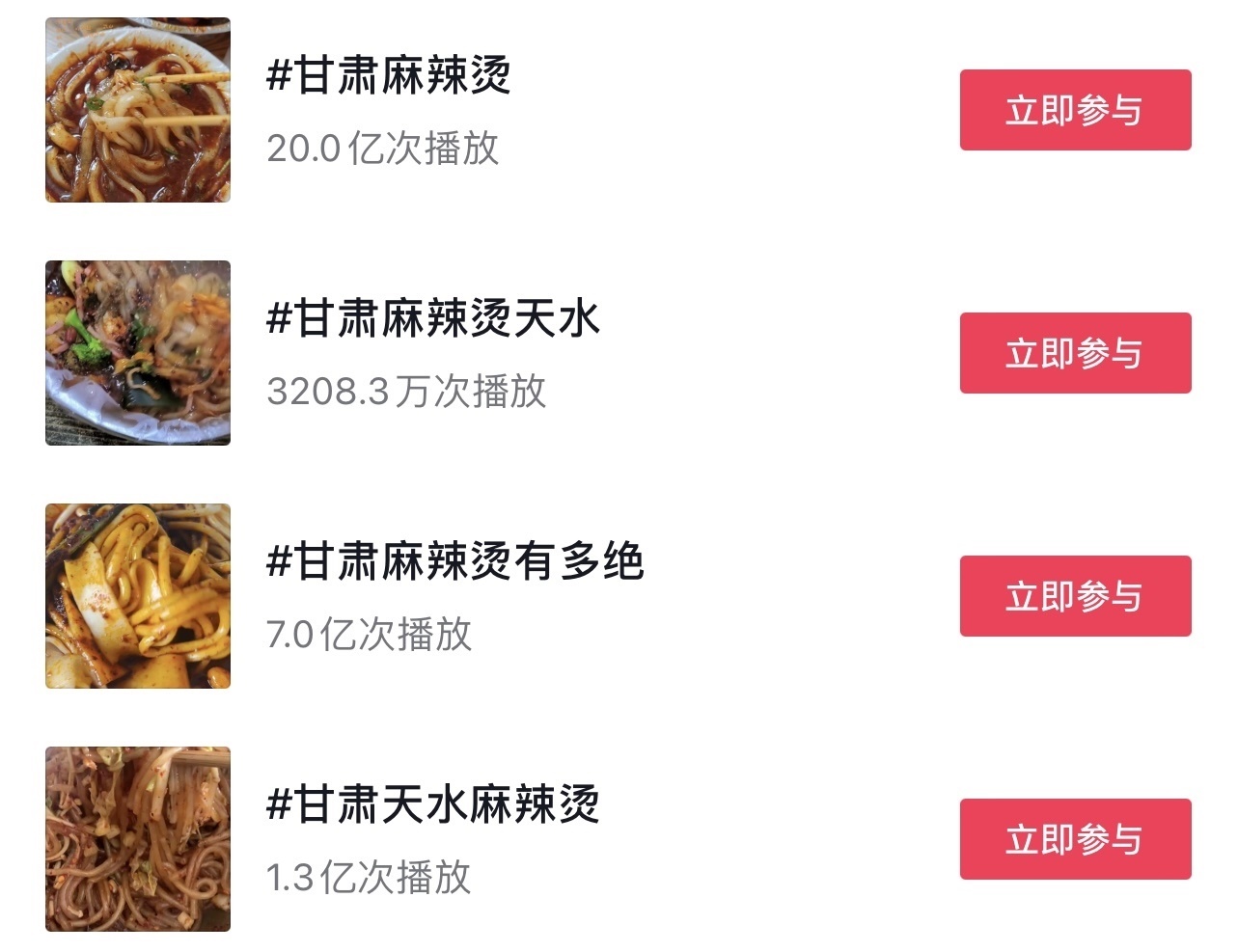 “這兩條視頻吸引了大量網(wǎng)民觀看、點贊、轉(zhuǎn)發(fā),之后陸續(xù)有網(wǎng)民發(fā)布相關(guān)視頻。”3月18日,甘肅省文化和旅游廳在回復(fù)網(wǎng)友建議中提到,3月份以來,“甘肅麻辣燙”話題迅速發(fā)酵,視頻內(nèi)容迅速增加,多次登上抖音、快手等短視頻平臺熱榜。截至3月16日18:00,各大短視頻平臺上“甘肅麻辣燙”相關(guān)話題累計播放量已超過32.6億次。