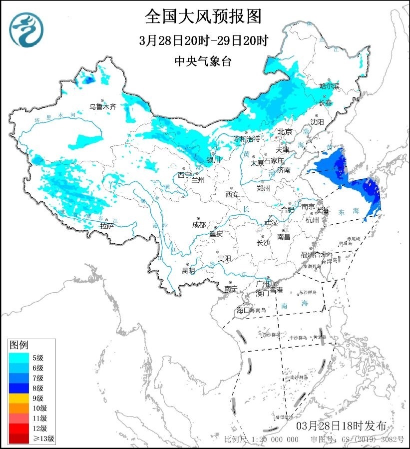 預(yù)計(jì),3月28日20時(shí)至29日20時(shí),內(nèi)蒙古大部、吉林西部、遼寧南部、甘肅東部、寧夏北部等地有5~6級(jí)、陣風(fēng)7~9級(jí)風(fēng);黃海中部和南部海域、東海東北部海域?qū)⒂?~8級(jí)、陣風(fēng)9級(jí)風(fēng),其中東海東北部的部分海域風(fēng)力可達(dá)9級(jí)、陣風(fēng)10級(jí)。