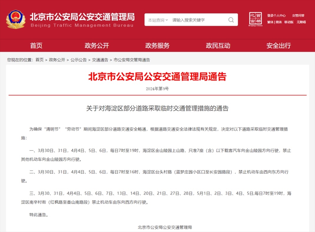 央視網(wǎng)消息:據(jù)北京市公安局公安交通管理局消息,3月26日,北京市交管局網(wǎng)站發(fā)布《關(guān)于對(duì)海淀區(qū)部分道路采取臨時(shí)交通管理措施的通告》,為確保“清明節(jié)”“勞動(dòng)節(jié)”期間海淀區(qū)部分道路交通安全暢通,根據(jù)道路交通安全法律法規(guī)有關(guān)規(guī)定,決定對(duì)以下道路采取臨時(shí)交通管理措施。