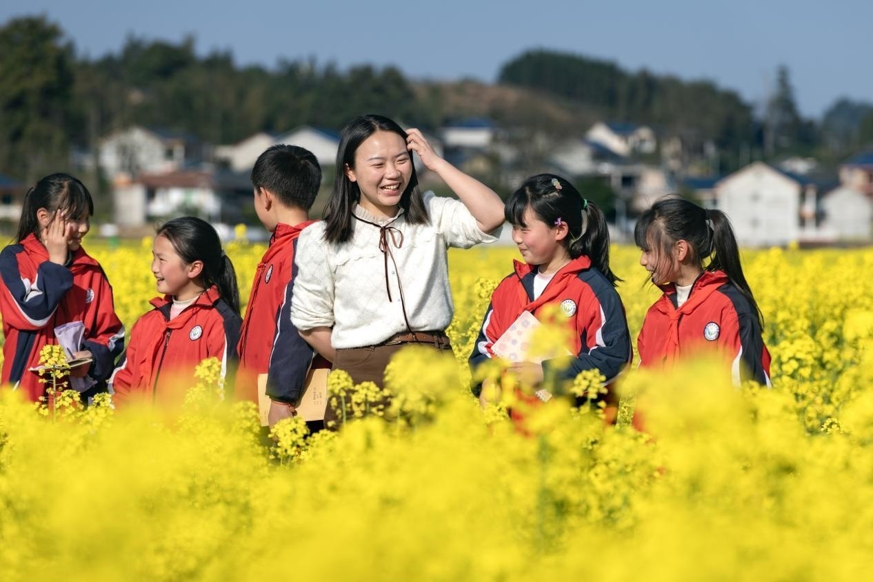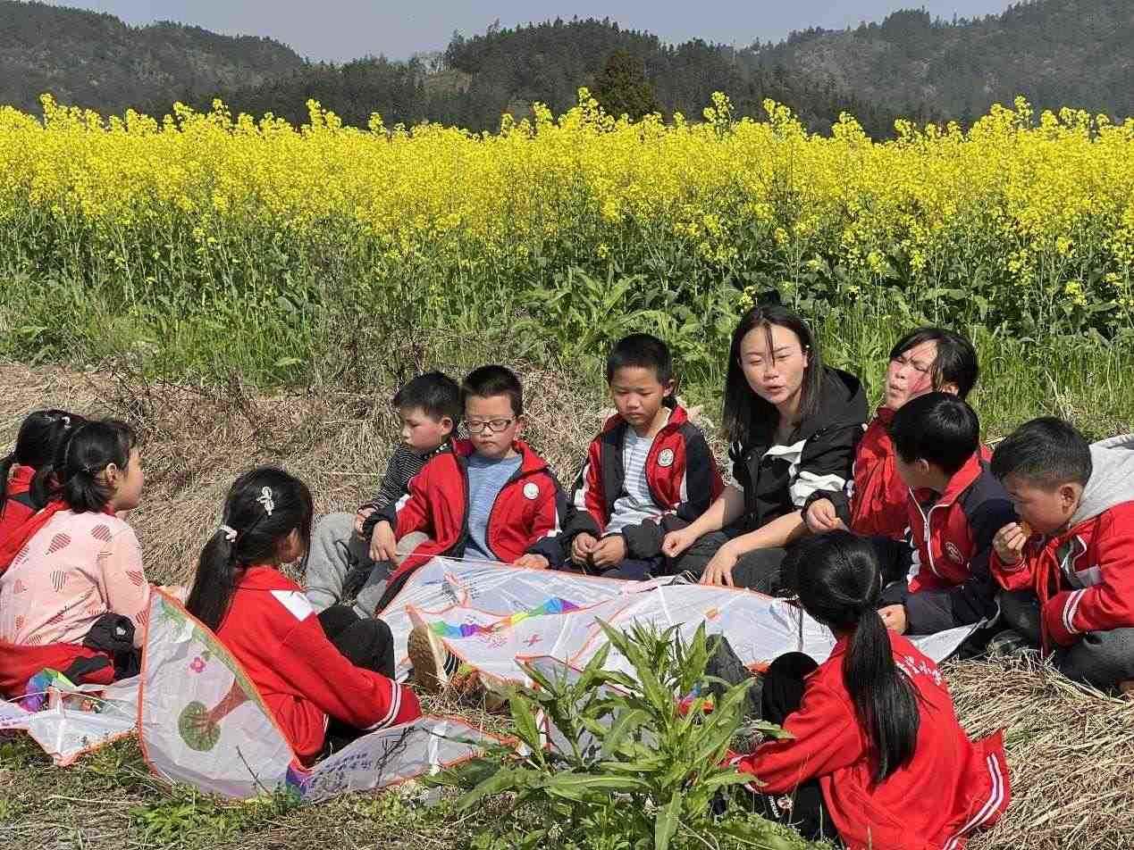 李柏霖不愿意讓孩子們覺(jué)得這樣的情緒是生活的全部。她把課堂搬到野外,在“搖搖花”開(kāi)的時(shí)候帶孩子們?nèi)タ础皳u搖花”,油菜花開(kāi)時(shí)去看油菜花?;ㄒ彩窃?shī),家鄉(xiāng)也是詩(shī)——若非如此,老師為什么走了又回呢?