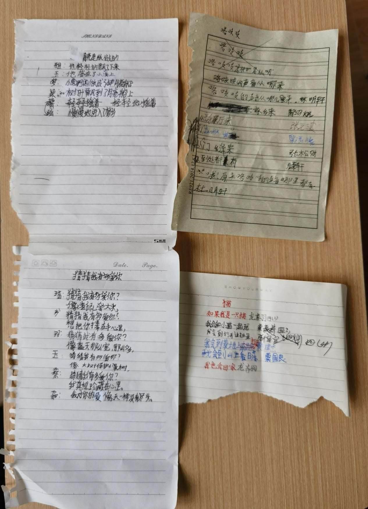 11歲的龍夢(mèng)瑤是詩(shī)班里高產(chǎn)的一個(gè)。她在本子上擠擠挨挨寫(xiě)一團(tuán)字,一把撕下整頁(yè),塞給李柏霖。這樣的紙片,李柏霖一天要收到幾十張。大大小小夾在書(shū)里,她晚上批改完,第二天再拿回學(xué)校,在課堂上分享。她估計(jì),孩子們寫(xiě)的詩(shī)已經(jīng)超過(guò)2000首。