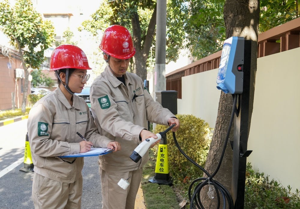 2023年11月29日,在上海市徐匯區(qū)田林十三村小區(qū)內,國網上海市南供電公司的工作人員在檢查充電樁運行情況。新華社記者 丁汀 攝