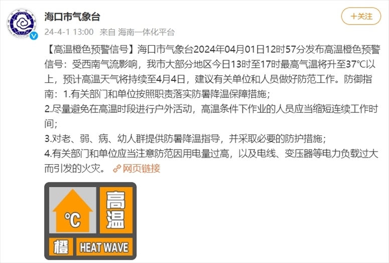 央視網(wǎng)消息:據(jù)@海口市氣象臺(tái) 微博消息,??谑袣庀笈_(tái)2024年04月01日12時(shí)57分發(fā)布高溫橙色預(yù)警信號(hào):受西南氣流影響,??谑写蟛糠值貐^(qū)今日13時(shí)至17時(shí)最高氣溫將升至37℃以上,預(yù)計(jì)高溫天氣將持續(xù)至4月4日,建議有關(guān)單位和人員做好防范工作。