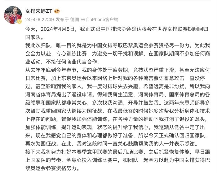 ·中國女排名將朱婷發(fā)文稱,將會在世界女排聯(lián)賽期間回歸國家隊。