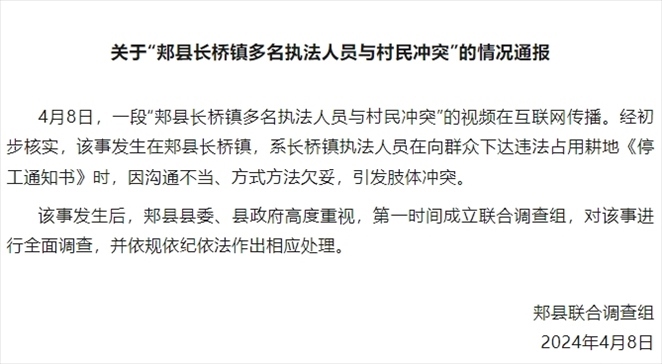 ·河南郟縣通報“多名執(zhí)法人員與村民發(fā)生沖突”:成立聯(lián)合調(diào)查組。