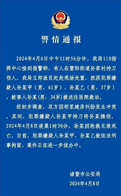 ·浙江諸暨警方通報律師被捅傷致死:兩名犯罪嫌疑人已被依法刑事拘留。