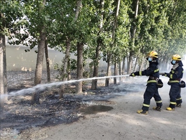 圖三:2023年5月2日,河南省濟(jì)源市消防救援支隊濟(jì)瀆路特勤站在處置飛絮引發(fā)的火情(來源:新華社)