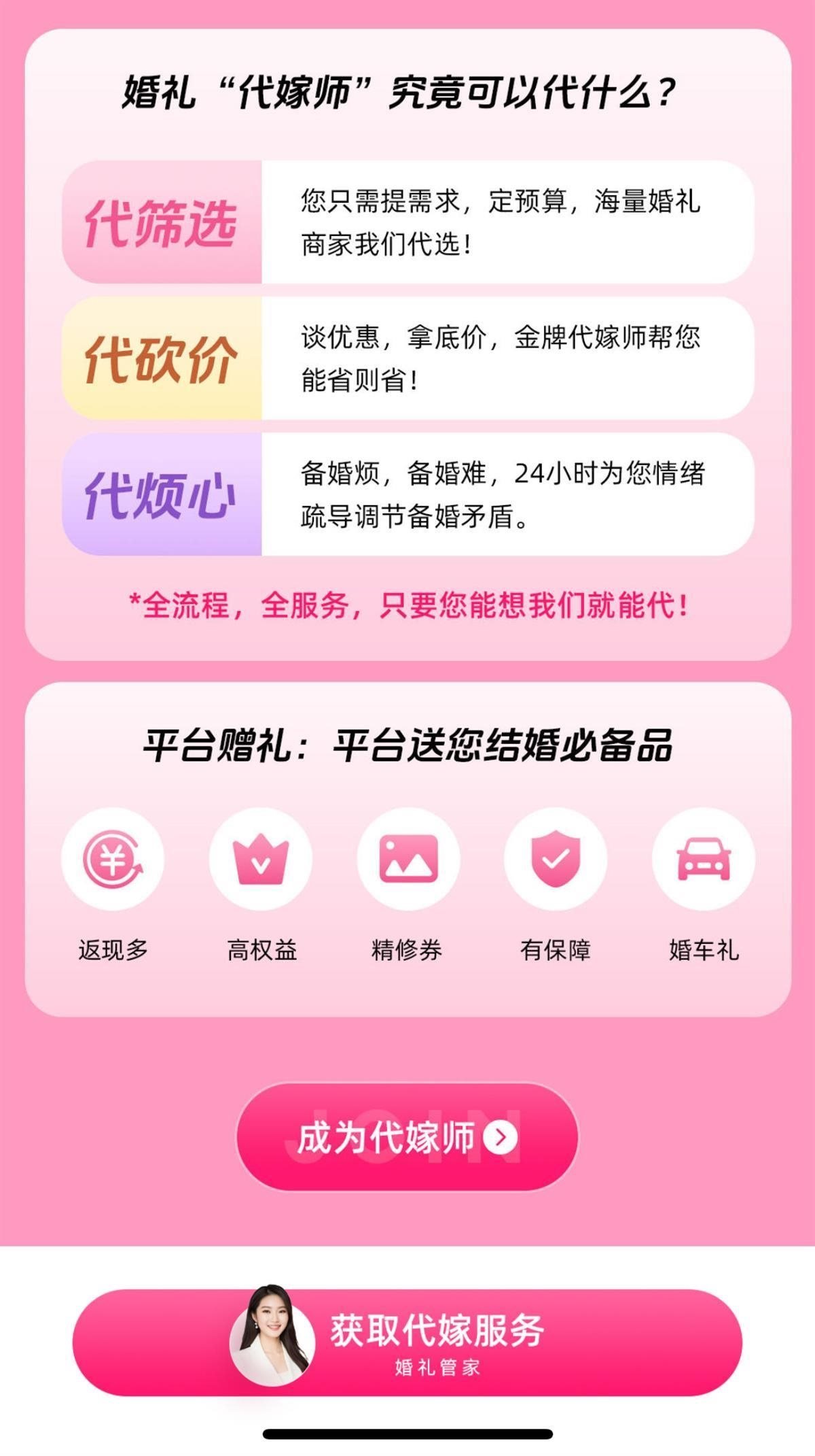 發(fā)布這一崗位招聘信息的公司名為杭州火燒云科技有限公司。4月17日,極目新聞記者登錄該公司運(yùn)營的“婚禮紀(jì)”APP,首頁顯眼位置便顯示有“50萬年薪‘代嫁師’幫你備婚”字樣。點(diǎn)擊進(jìn)入該板塊,映入眼簾的便是“預(yù)約免費(fèi)領(lǐng)取,專項(xiàng)3重大禮”的宣傳。