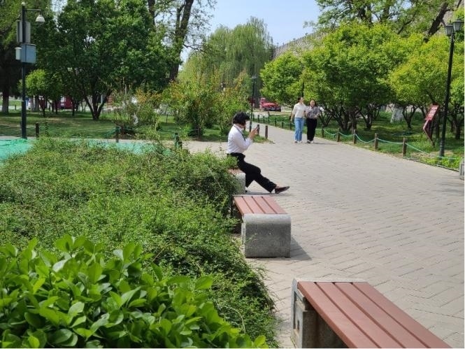 中午1時,走進北京明城墻遺址公園,春色襲人。玉棠廣場中,半數(shù)以上的人身著偏正式服裝或佩戴著工牌。他們有的獨坐小憩,有的兩人結(jié)伴,有的三五成群。在亭廊軒組合處,四位女士圍坐在一起交流生活中的小事,不時傳出陣陣笑聲。