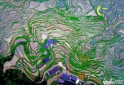 2024年4月25日,廣西柳州,苗寨的高山梯田儲(chǔ)水待插,層層疊疊如“大地指紋”。