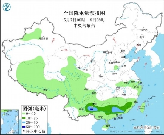 全國降水量預報圖(5月6日08時-7日08時)