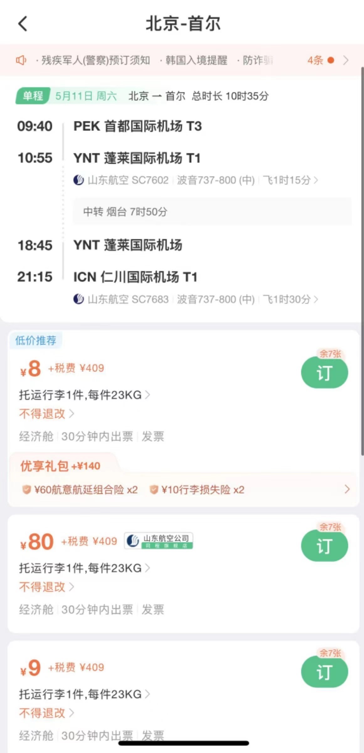 在線旅行平臺(tái)顯示,5月11日北京飛往首爾的一趟航班機(jī)票(不含稅)價(jià)格低至8元。加上稅費(fèi)之后價(jià)格是417元。