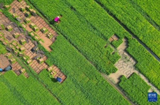 5月5日,在四川省內(nèi)江市東興區(qū)長江現(xiàn)代農(nóng)業(yè)園區(qū),農(nóng)民在集中育秧基地起秧苗(無人機照片)。