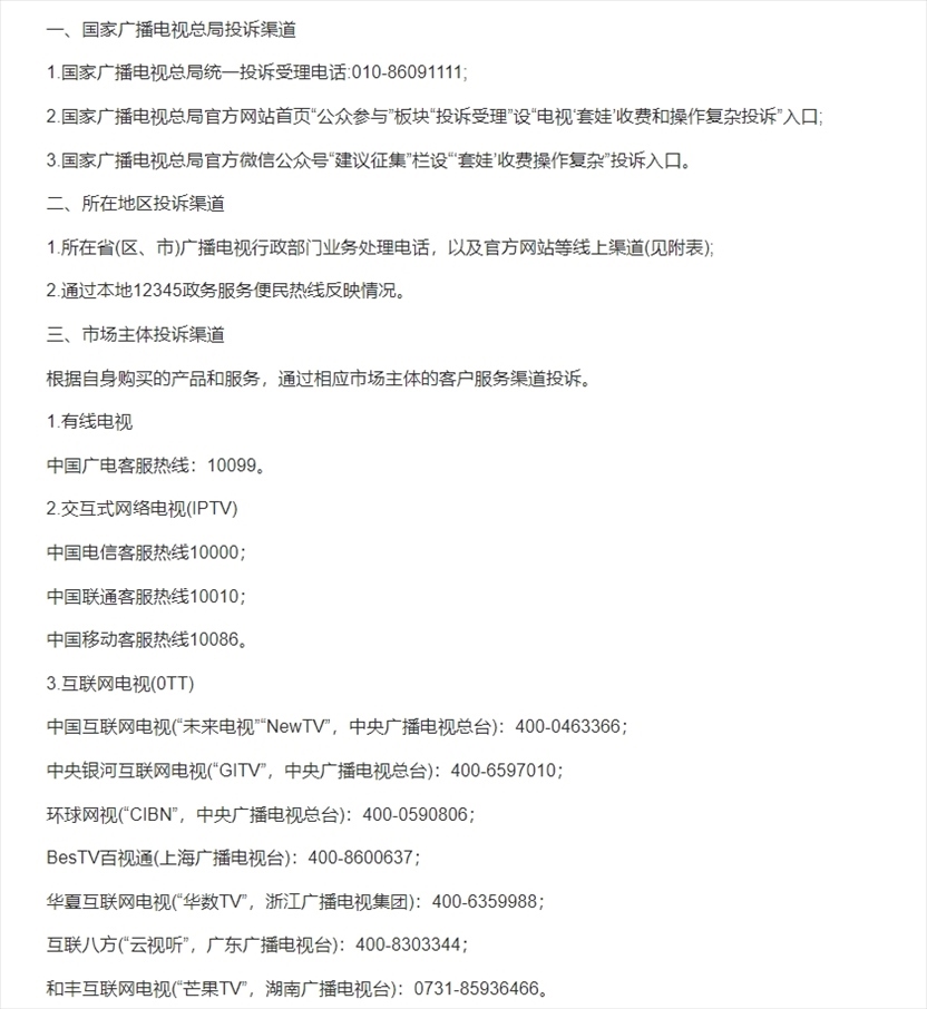 ·治理電視“套娃”收費和操作復(fù)雜工作投訴渠道公布。
