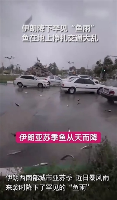 ·近日,伊朗亞蘇季市暴風雨來襲時,天空降下罕見“魚雨”。