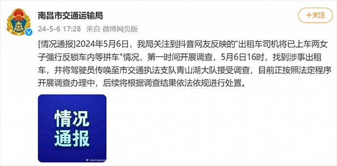 ·網(wǎng)友稱出租車司機將兩女子反鎖車內(nèi)等拼車,南昌市交通運輸局回應(yīng)。