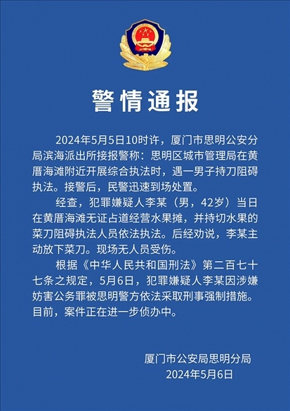 ·廈門警方:無證占道經(jīng)營還持刀阻礙執(zhí)法,一男子被采取刑事強制措施。