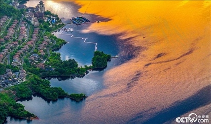 2024年5月6日清晨,杭州千島湖,朝霞倒影在湖面上,色彩斑斕。