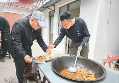 趙昊(右)在劉皮村“孝善大食堂”為鄉(xiāng)親打飯。健康時(shí)報(bào)記者 韓金序攝