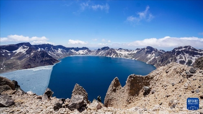 近日,長(zhǎng)白山天池冰層逐漸消融,迎來(lái)“開冰季”,吸引大量游客前來(lái)觀賞。