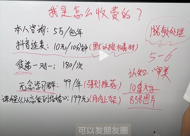 此外,不少婚戀軍師都公開了聯(lián)系方式,通過提供一對(duì)一指導(dǎo)、付費(fèi)視頻、情感課程、收徒、經(jīng)營(yíng)朋友圈教學(xué)等形式斂金,且價(jià)格不菲。