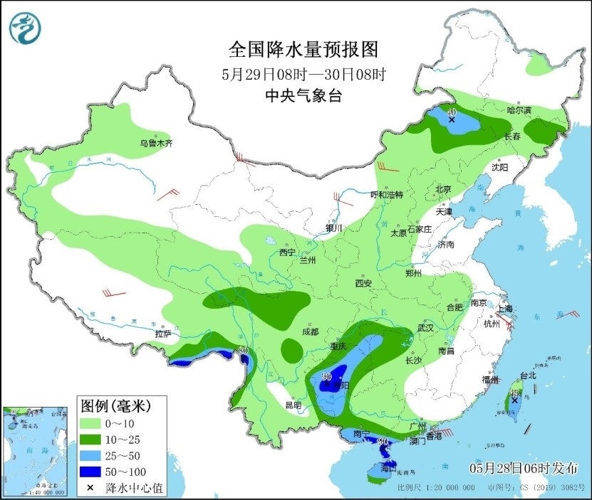 人民網(wǎng)北京5月28日電 (溫璐、高清揚(yáng))據(jù)中央氣象臺(tái)網(wǎng)站消息,昨日,較強(qiáng)降水主要出現(xiàn)在江南中東部、華南及西南地區(qū)東南部等地,其中,安徽銅陵,浙江金華和衢州,福建南平,廣東江門(mén)和茂名,廣西玉林、崇左、百色和南寧,云南文山等局地出現(xiàn)大暴雨。預(yù)計(jì)今明兩天,南方地區(qū)強(qiáng)降水范圍收縮,暴雨預(yù)警今晨已降級(jí)為藍(lán)色,但華南南部、西南地區(qū)東部等地部分地區(qū)仍雨勢(shì)較強(qiáng),公眾需關(guān)注持續(xù)降雨對(duì)交通出行的不利影響,注意出行安全。