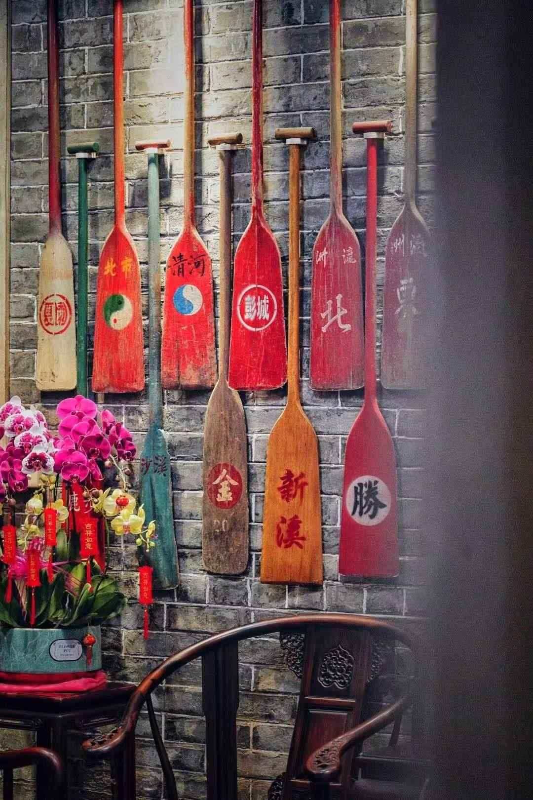 在張偉潮工作室的青磚墻上掛滿了劃龍舟所用的船槳?!皝?lái)取龍頭的人大多會(huì)送一面錦旗,我說(shuō)不要錦旗,可以把你們不用的槳送給我。”這些年張偉潮陸續(xù)收到了300多支船槳,在他看來(lái),每一把槳都蘊(yùn)含著自己隊(duì)伍、村落的故事,每一把都是獨(dú)一無(wú)二的,他要把船槳當(dāng)作錦旗一樣高高地掛在墻上。